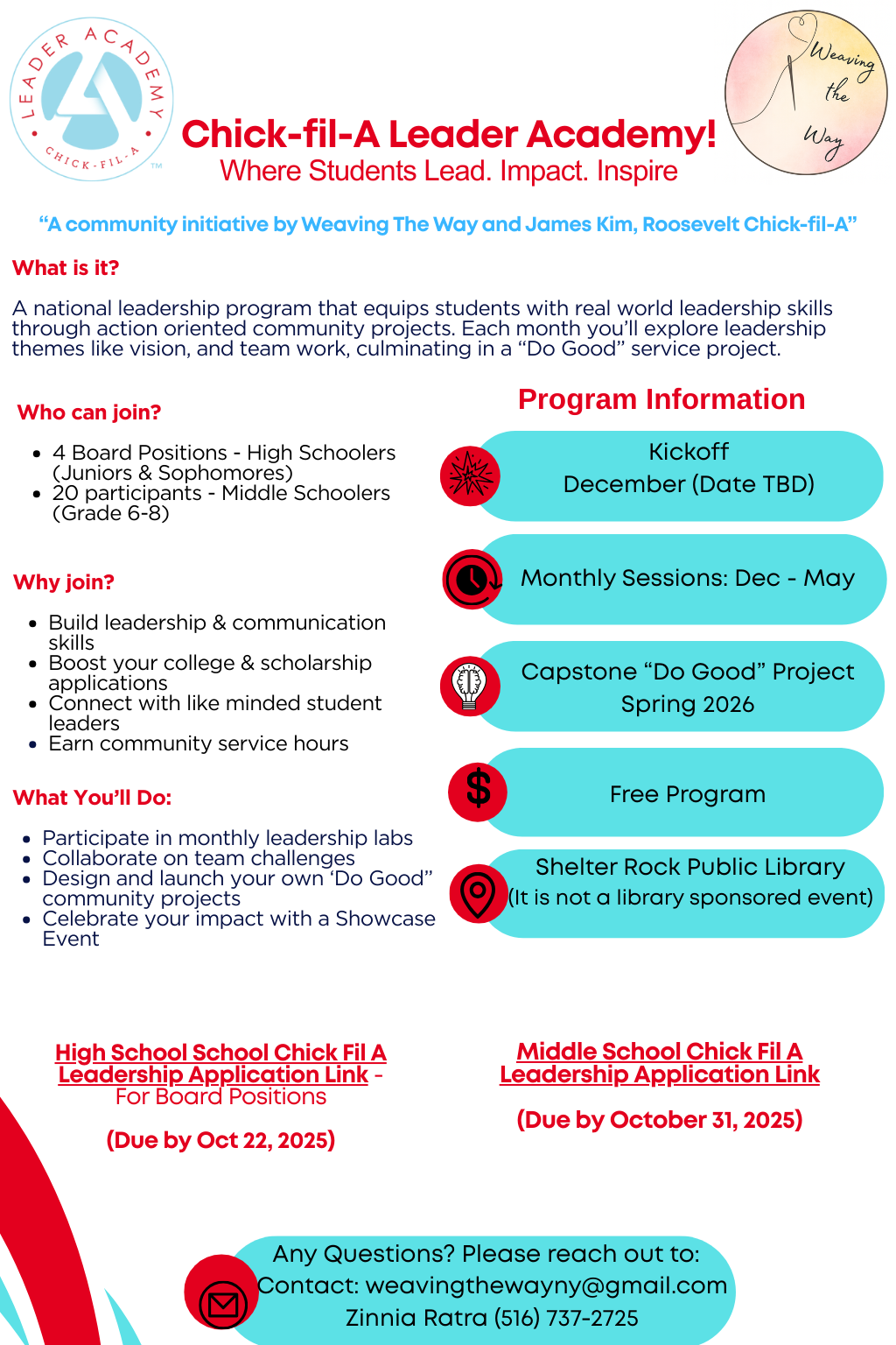 Weaving the Way, in partnership with Chick-fil-A Leader Academy, proudly launches a unique leadership initiative designed to empower middle school students across Long Island. Through hands-on leadership development, service-based learning, and collaborative projects, students build confidence, teamwork, and real-world leadership skills while serving their local communities. As part of this initiative, participants lead a meaningful fundraising effort in support of the American Cancer Society, turning leadership into impact and compassion into action.